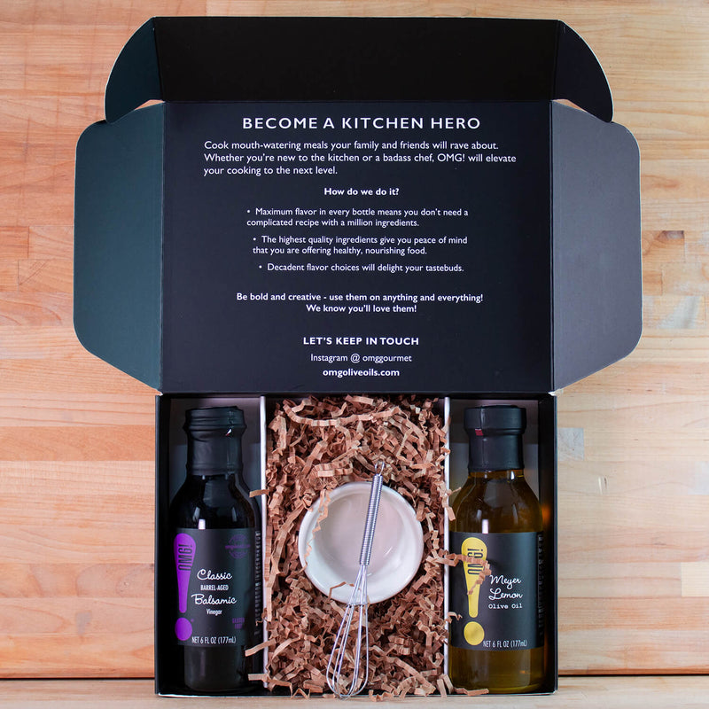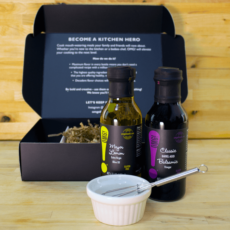 Includes: One Olive Oil of your choosing, One Balsamic Vinegar of your choosing as well as a five-inch whisk and small ramekin for mixing